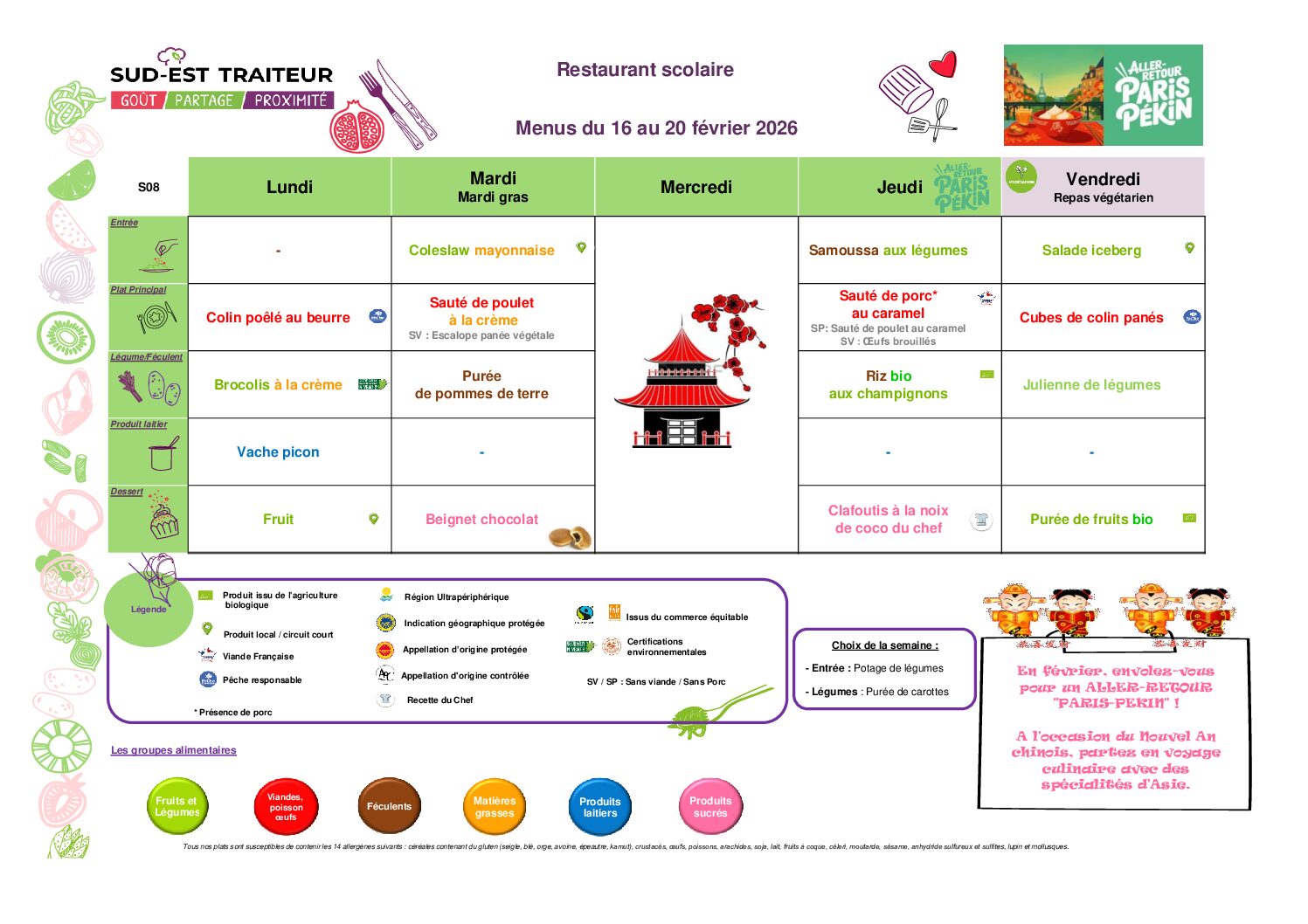 Menus du Lundi 9 au vendredi 13 février